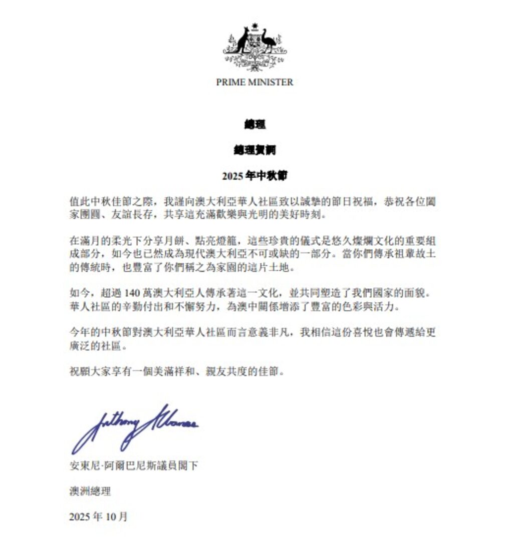10月5日,聯邦總理艾班尼斯(Anthony Albanese)發佈中秋節賀詞,賀詞全文如下: