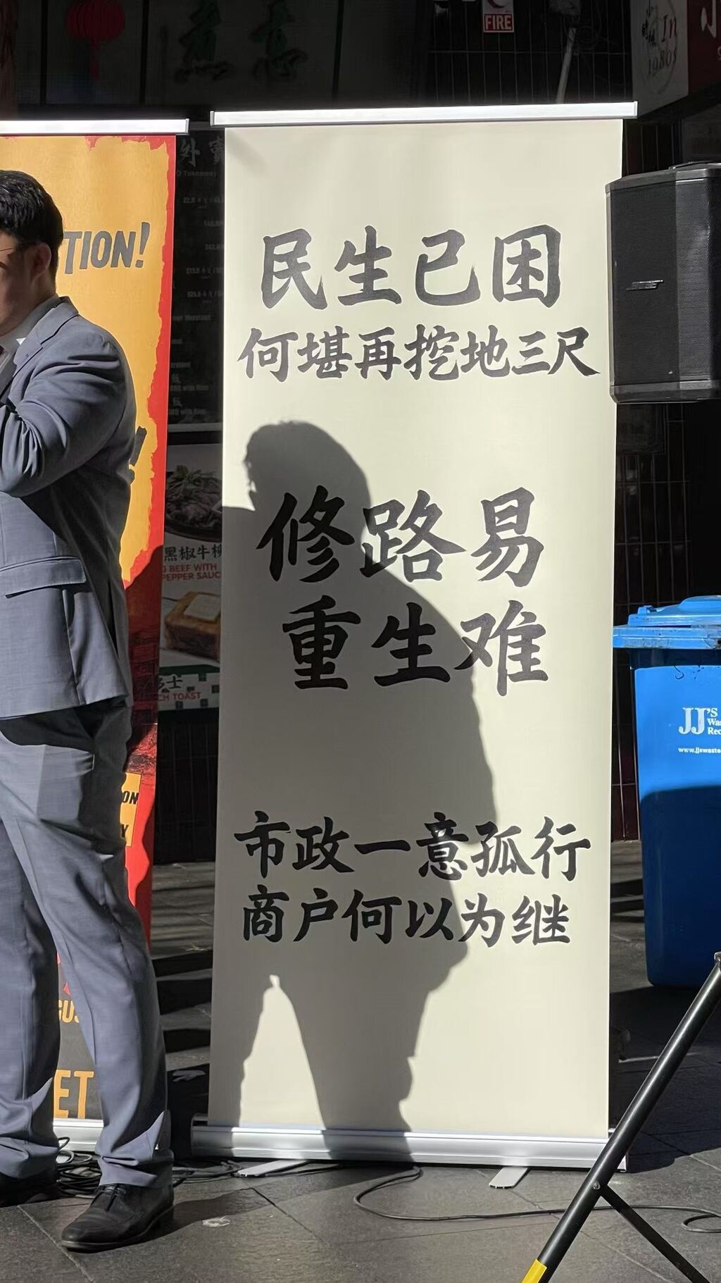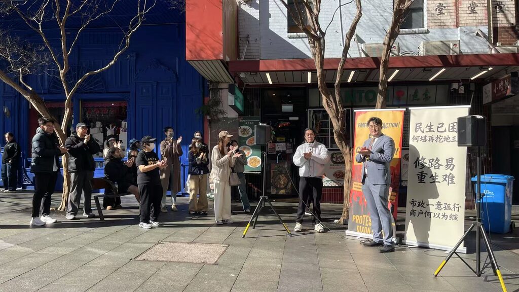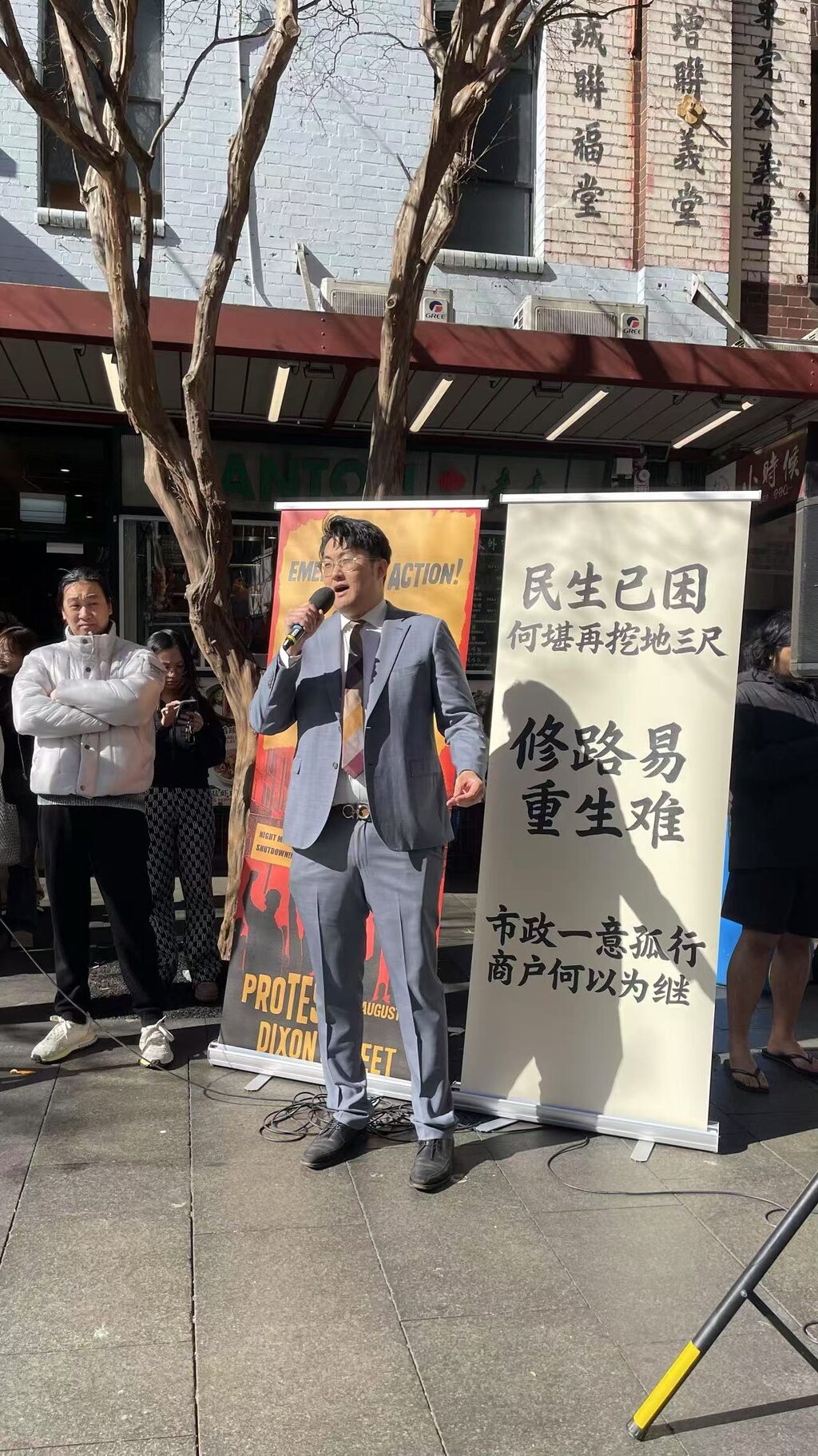 是次集會是唐人街商戶自發舉辦,區內逾20位年青商戶代表參加,活動歷時半個多小時。活動召集人 Tom Wang 在集會上發言時,首先對所有到場支持的商戶代表表達感謝。他指出,商戶並非反對整體悉尼唐人街的翻新計劃,而是希望取消其中一項具爭議性的內容「地面翻新工程」。該項工程預計需時8至10個月才能完成,儘管採取分階段方式進行,但仍將為唐人街帶來長期施工噪音與塵埃,對人流造成重大影響和不便。他強調,這種影響相當於疫情封鎖期間的商業困境,而不同於疫情時期的全市受創,這次僅是唐人街首當其衝,其他如 Burwood 與 Eastwood 等華人商圈則未受影響。Tom Wang 表示,商戶的訴求主要包括兩點,其一為希望市議會能重新審視甚至取消地面翻新項目,其二則是建立具體磋商機制,讓受影響商戶能夠提出意見與建議,並尋求雙方都能接受的解決方案。他指出,自2024年中市議會於網上展開翻新項目意見徵詢以來,他本人與部分商戶已多次透過電郵提出關注,並曾與悉尼市長摩雅交談,希望促成一次與商戶的正式會議。然而,相關溝通至今未有具體進展,亦未舉行廣泛諮詢會議。他認為,當前市議會將資源投放於地面翻新,卻無實質效益,不但難以吸引顧客,反而造成長期干擾。他指出,資源應集中改善街區中民眾真正可感受、可使用的設施,如照明、外觀設計、導覽標示等。Tom Wang 亦提到,商戶代表期望獲得市議員與媒體關注,讓其聲音被聆聽,並爭取設立協商機制。他以 Oxford Street、Kings Cross 及 George Street 等地為例,這些街道在歷經翻新工程後,曾經繁華一時,卻因施工影響人流導致商業活動衰退。他認為,唐人街可能面臨相同命運,而其他商業街區將來亦可能出現類似情況。此外,他還批評市議會的工程時間表屢次落空,指出德信街牌坊原預計於2025年1月完成翻新,但至今工程仍未完工。他對此表示強烈擔憂,認為未來工程亦可能出現同樣情況,對商戶營運構成更大風險。是次集會在和平、有序氣氛下完成,與會商戶表示,期望藉由發聲引起政府與媒體關注,促使市議會在實施後續工程前,與唐人街商戶建立更有效的溝通與協商平台。