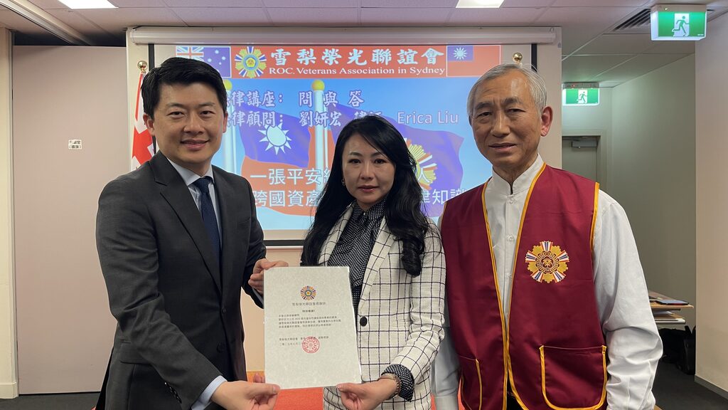 【本報悉尼訊】「一張平安紙、守護好家人」,為提升社區民眾對遺囑撰寫與財產繼承相關法律知識之認識,雪梨榮光聯誼會特別於7月30日(星期三)下午,在雪梨華僑文教服務中心舉辦免費法律講座。活動吸引逾百位與會嘉賓出席,會場座無虛席,反應熱烈。參加的貴賓有駐雪梨台北經濟文化辦事處吳正偉處長,雪梨華僑文教服務中心主任江佳慧,雪梨台灣貿易中心主任蔡英庠,安瑩法律事務所劉姘宏律師 ,郭庭亮委員,梁少君顧問,林鳳嬌委員(司儀),前空軍上校楊宏宇,前陸軍軍訓教官中校吳志中,前陸軍少校李麗莊,前陸軍上尉王麗珠,張彝倫院長,劉惠祝前專員,程紀罡台商副會長,賴文娟華協會長,陳清詩榮光會副會長,前會長殷森安,李瑞惠,虞蘡絳,陳紹樑,張淑語,洪澤福,張士超,謝旺達前副會長,黃君毅前中文學校主任,關德基書法老師,賴錦鳳,賴書珩,前中文學校老師等。