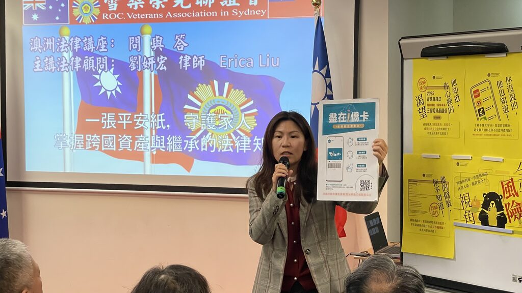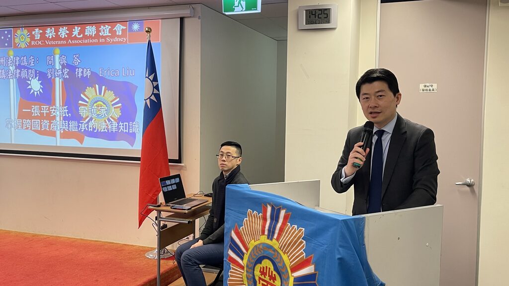 講座在莊嚴的澳洲原住民致敬儀式中揭開序幕,全體來賓肅敬聆聽傳統宣言,共同向澳洲原住民族表達敬意。隨後,榮光聯誼會會長於展威致詞,熱情歡迎各界嘉賓蒞臨,並表達誠摯感謝。活動現場嘉賓雲集,增添光彩。駐雪梨台北經濟文化辦事處處長吳正偉特別撥冗出席,他在致詞中肯定榮光聯誼會在於會長帶領下,長期服務僑界、推廣法律與文化教育,充分展現退伍軍人榮譽精神。他並讚揚主講人劉姘宏律師熱心公益,長期無償協助代表處提供法律協助,貢獻卓著,深獲肯定。雪梨華僑文教服務中心主任江佳慧亦有致詞,代表主辦地單位歡迎所有來賓,並表示文教中心將持續支持僑團舉辦多元活動,促進社區交流與文化傳承。她亦介紹僑務委員會推出的「E-僑卡」服務,鼓勵僑胞踴躍申辦,便利生活。台灣貿易中心雪梨辦事處主任蔡英庠則分享最新展覽行事曆,誠摯邀請現場嘉賓參與即將登場的台灣貿易展與食品展,促進臺澳雙邊經貿合作。隨後立即展開專題講座,遺囑與跨國資產繼承的法律實務。本次講座主題為:「遺囑財產的法律效力與常見誤區,一張平安紙,守護家人」,由深耕社區法律服務逾二十年的劉姘宏律師主講。劉律師為榮光聯誼會法律名譽顧問、現任僑務顧問,亦曾擔任澳洲台灣商會及大洋洲台灣商會聯合總會名譽總會長,其創立之安瑩法律事務所(GOH Lawyers)於雪梨享有盛譽,專精處理遺產與跨國法律事務。演講內容深入淺出,涵蓋以下重點:「遺囑之法律效力與實務須知」,「撰寫遺囑常見錯誤與家庭爭產案例解析」,「跨國資產繼承的法律挑戰與應對建議」,「實用法律知識與預防風險的規劃方向」。在提問與互動交流環節中,與會者踴躍發問,現場討論熱烈,展現社區對此類議題的高度重視與實務需求。精緻安排溫馨互動,為營造友善、舒適的學習環境,主辦單位特別準備咖啡、牛奶與餅乾,並由劉律師慷慨贊助三明治下午茶,讓來賓在獲取實用法律知識的同時,也能享受輕鬆愉快的交流時光。T
