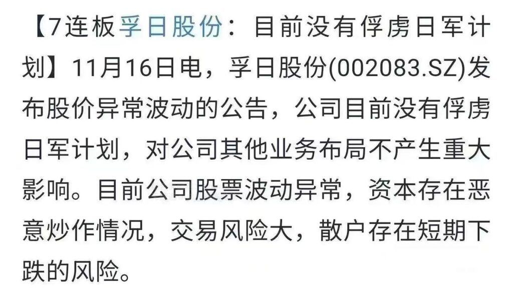 就在市場亢奮之際,一張「7連板孚日股份:目前沒有俘虜日軍計畫」的截圖在剛剛過去的周末迅速發酵。這張在網絡上流傳的截圖中,孚日股份於「11月16日電」發布公告稱,「公司目前沒有俘虜日軍計畫」,並罕見提示「資本存在惡意炒作情況」及「散戶存在短期下跌的風險」。但記者透過所有法定資訊揭露管道,均未查到孚日股份發布上述內容的公告。記者發現,網傳截圖日期「11月16日電」,與孚日股份當晚真實發布的《關於公司股價異常波動的公告》(臨2025-065。落款11月17日)時間相近。在這份真實公告中,與網傳截圖對應的原文是:「孚日新能源目前暫無擴產計畫,對公司其他業務布局不產生重大影響。」值得注意的是,網傳截圖中後半段關於風險的陳述,與公司真實公告的原文也並不一致,甚至有添油加醋的嫌疑。真實公告的原文為「可能存在非理性炒作」和「存在短期下跌的風險」;而網傳截圖則將其篡改為「資本存在惡意炒作情況」和「散戶存在短期下跌的風險」,用詞更為嚴厲,指向也更明確。網傳截圖的出現,與近期市場對孚日股份的「玄學炒作」相呼應。17日,中新經緯以投資人身分致電孚日股份董秘辦,一位接線人員表示,近期公司股價上漲與電解液添加劑VC(碳酸亞乙烯酯)價格上漲有關。截至目前,VC價格已從底部4.5萬元/噸漲至超10萬元/噸,漲幅達150%。對於是否關注到市場上關於公司名字的討論,上述接線人員說,「股價上漲與公司名字無關,那是網友們自己想的。」這與公司基本面形成鮮明對比:公司2025年前三季營收、淨利雙雙下滑,而被寄予厚望的孚日新能源實則淨利虧損約3,032萬元。面對股價暴漲,孚日股份已連續發布異動公告,「可能存在非理性炒作,交易風險大,存在短期下跌的風險。敬請廣大投資者註意交易風險,切勿盲目跟風,理性決策,審慎投資。」分享 / Share :