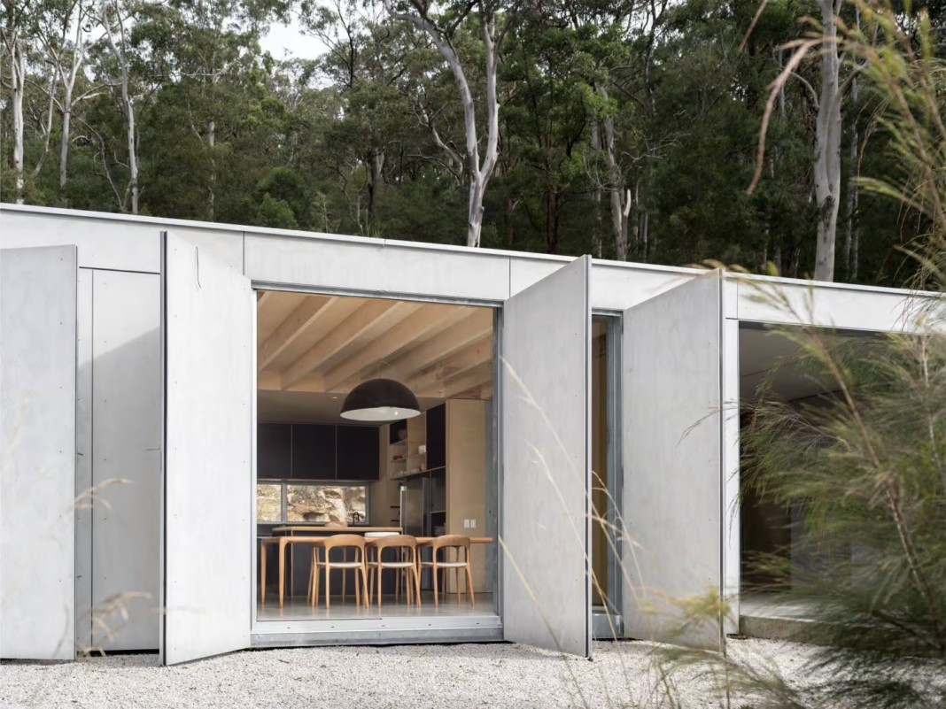 建築坐落於叢林,可旋轉的纖維水泥包覆面板是亮點。打開時連通住宅與自然,關閉則如鎧甲抵禦火災。吉布尼初見占地4000平方米的土地,便被其原始之美震撼。該地靠近悉尼以北約300公里處Seal Rocks村的Smiths Lake,坡度大、植被繁茂,在此建房大膽且具挑戰。