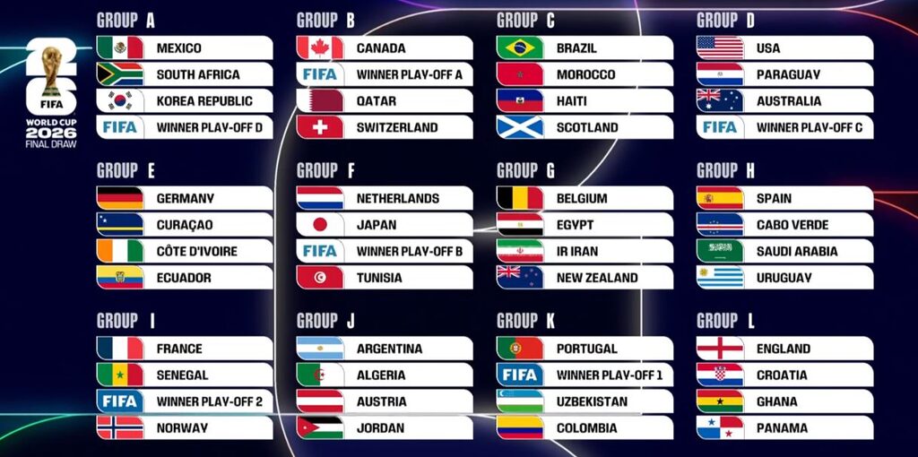 2026年世界盃將於明年6月11日至7月19日於美國、加拿大及墨西哥共16個城市舉行,今屆決賽周亦首次增至歷來最多的48支球隊,分12組各4隊,而包括自動躋身決賽周的3個主辦國在內,共42隊經已落實,餘下6隊將於明年3月舉行的附加賽定出。是次抽籤儀式於華盛頓約翰甘迺迪表演藝術中心舉行,美國總統特朗普、加拿大總理卡尼及墨西哥總統欣鮑姆均列席,並分別抽出各自代表國家隊的分組結果。上屆由球王美斯領銜下奪冠的阿根廷隊,今屆被抽入J組,對方分別是奧地利、阿爾及利亞及約旦隊。前屆盟主法國隊在I組將面對挪威隊,其餘兩隊則是塞內加爾隊及一支待定的洲際附加賽出線隊。上屆歐洲國家盃盟主西班牙隊位處H組,將與烏拉圭、沙特阿拉伯及非洲新丁佛得角隊碰頭。至於英格蘭隊位處L組,將繼2018年一屆的4強後再於世盃大戰克羅地亞隊,同組其餘對手則是加納及巴拿馬隊。另外,東亞勁旅「藍武士」日本隊今屆身處F組,對手為荷蘭、突尼斯及待定的歐洲附加賽出線隊;另一東亞強隊「太極虎」則抽得好籤於A組避開多支勁敵,對手為南非隊、東道主之一墨西哥隊,以及另一歐洲附加賽出線隊。值得一提的是,今屆淘汰賽將首次增設32強淘汰賽階段,每組前兩名直接出線外,12組當中8支最佳第3名亦可晉級,而屆時將以類似網球賽事的種子形式,以出線球隊的世界排名分配走線,減少強隊過早碰頭的機會。至於揭幕戰將是A組墨西哥在主場墨西哥城、可容納8.75萬人的阿茲特克體育場舉行,決賽則在可容納8.25萬人的美國新澤西大都會人壽體育場上演。2026年世界盃決賽周分組形勢A組:墨西哥、南非、韓國、歐洲附加賽DB組:加拿大、歐洲附加賽A、卡塔爾、瑞士C組:巴西、摩洛哥、海地、蘇格蘭D組:美國、巴拉圭、澳洲、歐洲附加賽CE組:德國、庫拉索、科特迪瓦、厄瓜多爾F組:荷蘭、日本、歐洲附加賽B、突尼斯G組:比利時、埃及、伊朗、新西蘭H組:西班牙、佛得角、沙特阿拉伯、烏拉圭I組:法國、塞內加爾、洲際附加賽2、挪威J組:阿根廷、阿爾及利亞、奧地利、約旦K組:葡萄牙、洲際附加賽1、烏茲別克、哥倫比亞L組:英格蘭、克羅地亞、加納、巴拿馬註:6支附加賽球隊將於明年3月決出,以下()內為所屬各個附加賽席位可能出線球隊歐洲附加賽A(意大利、威爾斯、波斯尼亞、北愛爾蘭),歐洲附加賽B(烏克蘭、波蘭、阿爾巴尼亞、瑞典),歐洲附加賽C(土耳其、斯洛伐克、科索沃、羅馬尼亞),歐洲附加賽D(丹麥、捷克、愛爾蘭、北馬其頓),洲際附加賽1(剛果民主共和國、牙買加、新喀里多尼亞),洲際附加賽2(伊拉克、玻利維亞、蘇里南)分享 / Share :